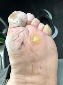 それで皮膚がふやけたようになっている足の裏、特に親指ですが、汗が乾燥して渇くと、カチカチに硬くなってタコ、ウオノメのようになります。
